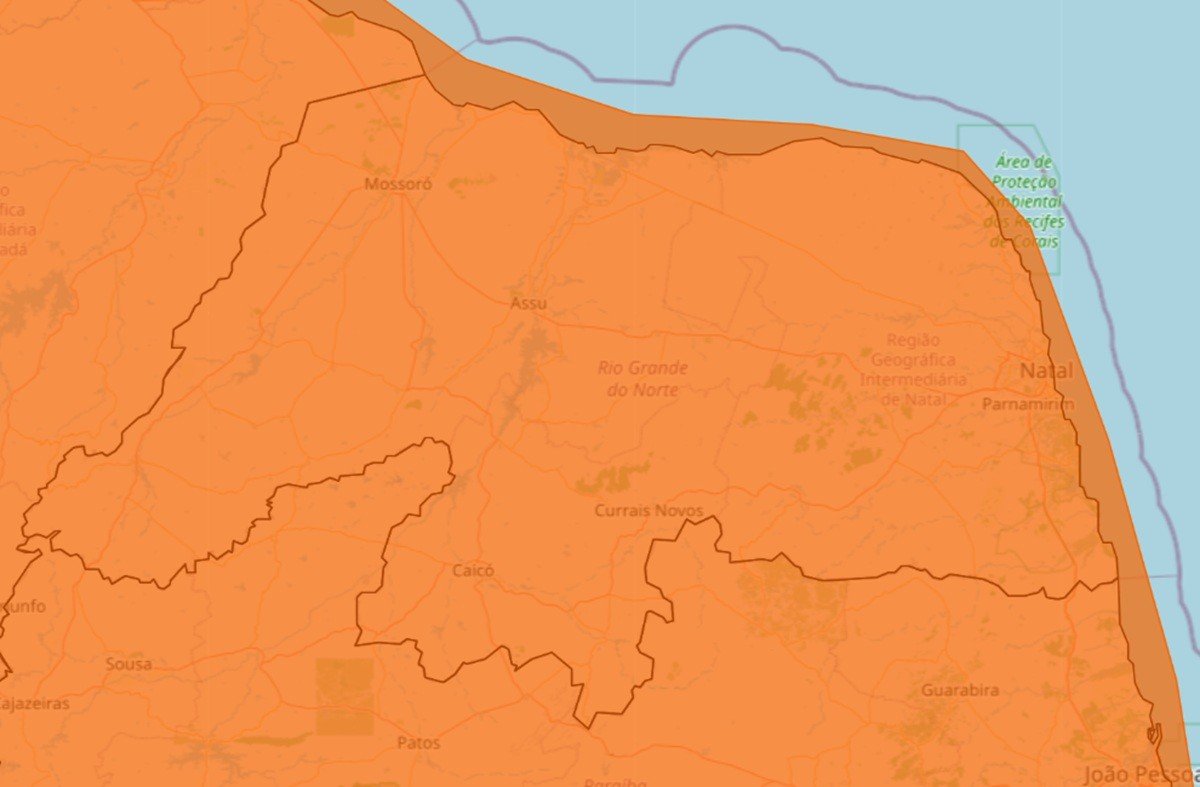 O risco inclui queda de energia, alagamentos, quedas de galhos e descargas elétricas. Em Natal, já foram registrados pelo menos 20 pontos de alagamento nesta sexta. O alerta laranja é o segundo nível mais grave na escala do Inmet, ficando atrás apenas do vermelho.