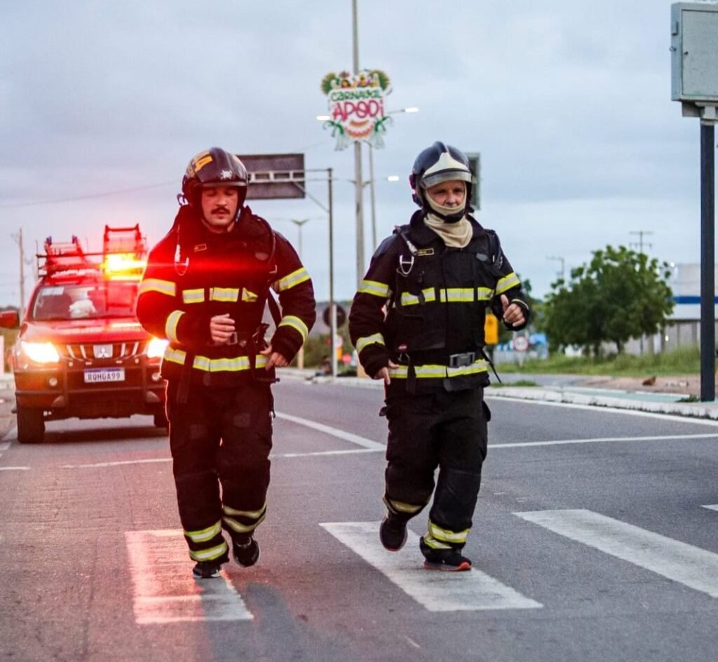 Três bombeiros militares participaram neste domingo (22) de uma corrida de 5,7 km em Apodi, comemorando a emancipação política da cidade. O desafio chamou atenção porque eles correram usando todo o equipamento de combate a incêndio, que pesa cerca de 30 quilos, incluindo capacete, cilindro de ar e roupa especial.