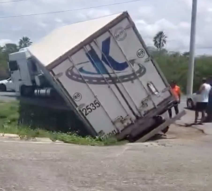 Uma carreta carregada com cerca de 25 mil quilos de melão tombou na BR-304, em Mossoró, nesta terça-feira (17). O acidente aconteceu durante uma manobra de retorno, quando a traseira do veículo caiu em uma vala à beira da rodovia, deixando a carreta atravessada na pista.