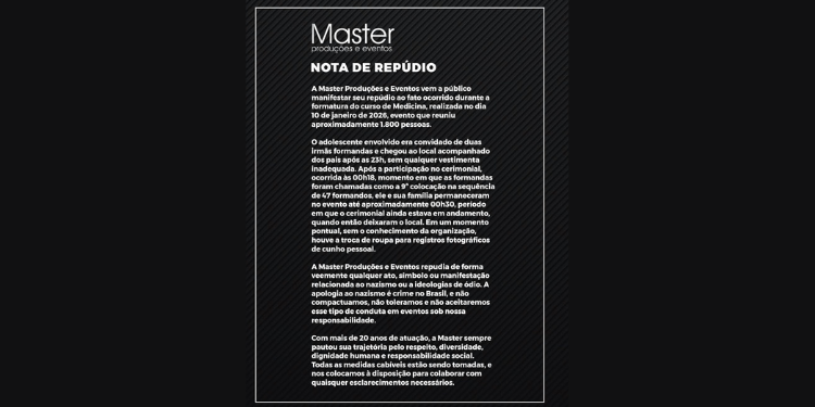 Na segunda-feira (12), a Master Eventos, responsável pela organização do evento, divulgou uma nota oficial repudiando o ato. A atitude foi considerada inaceitável e contrária aos valores da instituição e da sociedade.