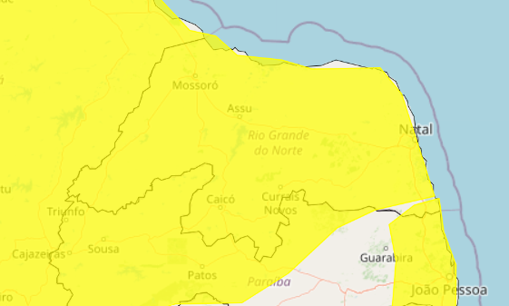 O Instituto Nacional de Meteorologia (Inmet) emitiu dois alertas de chuvas para o Rio Grande do Norte neste domingo (29). O primeiro aviso, válido até a noite, aponta para precipitações entre 20 e 30 mm por hora, podendo chegar a 50 mm no dia, com risco baixo de alagamentos e deslizamentos em áreas vulneráveis. As cidades afetadas são Baía Formosa, Canguaretama, Montanhas, Nova Cruz e Pedro Velho.