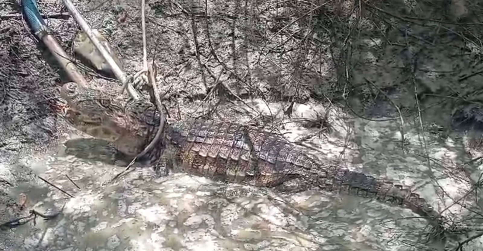 Um jacaré de 2,9 metros foi capturado neste sábado (28) na zona rural de Janduís, município do Oeste potiguar. O resgate aconteceu no sítio Livramento, onde o animal estava abrigado em uma poça de água da chuva.