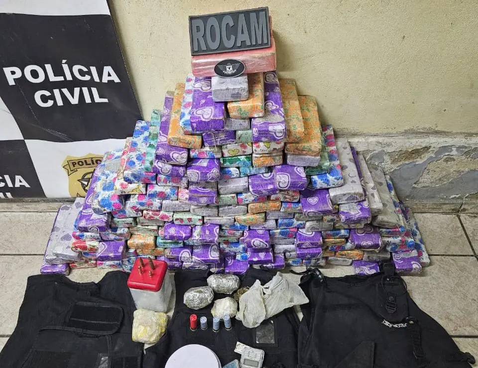 Durante a operação, os policiais localizaram 137 tabletes de maconha, cerca de 2,3 kg de crack e aproximadamente 300 gramas de cocaína. Também foram apreendidos três coletes à prova de balas, além de munições de diversos calibres, incluindo calibre 12, fuzil 7,62 e 5.56, revólver .38 e pistola .380, além de balanças de precisão.