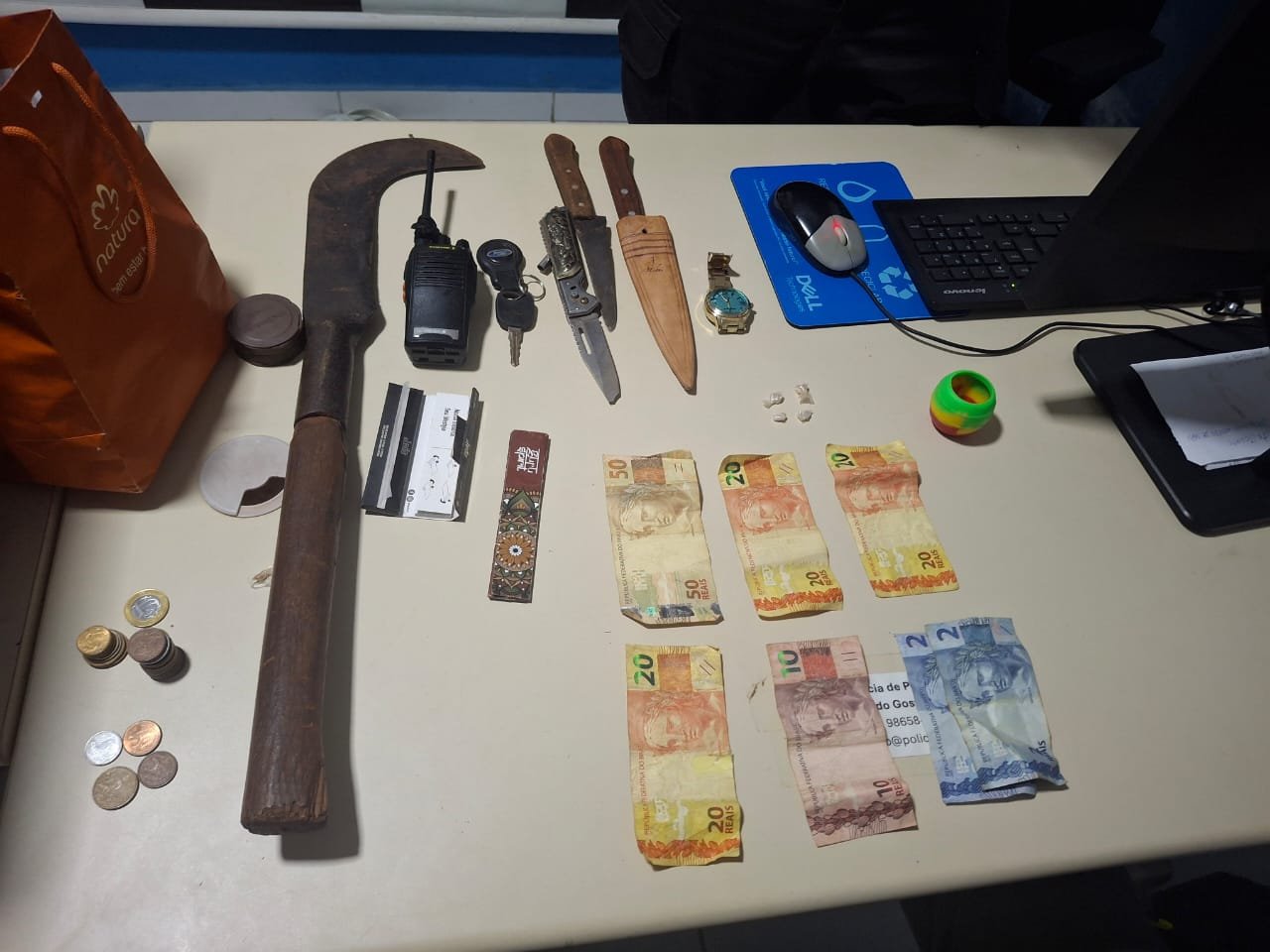 Com os suspeitos, os policiais encontraram drogas, dinheiro trocado, um rádio comunicador e várias armas brancas, itens que costumam ser usados na venda de entorpecentes. Os dois foram detidos e levados à delegacia de plantão para os procedimentos legais.