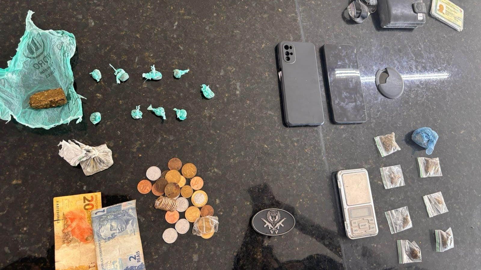 Durante a abordagem, os policiais encontraram com os suspeitos 18 porções de maconha, uma balança de precisão pequena e R$ 29,35 em dinheiro. Os três homens, de 18, 25 e 37 anos, foram presos em flagrante e levados à delegacia junto com os materiais apreendidos para os procedimentos legais.