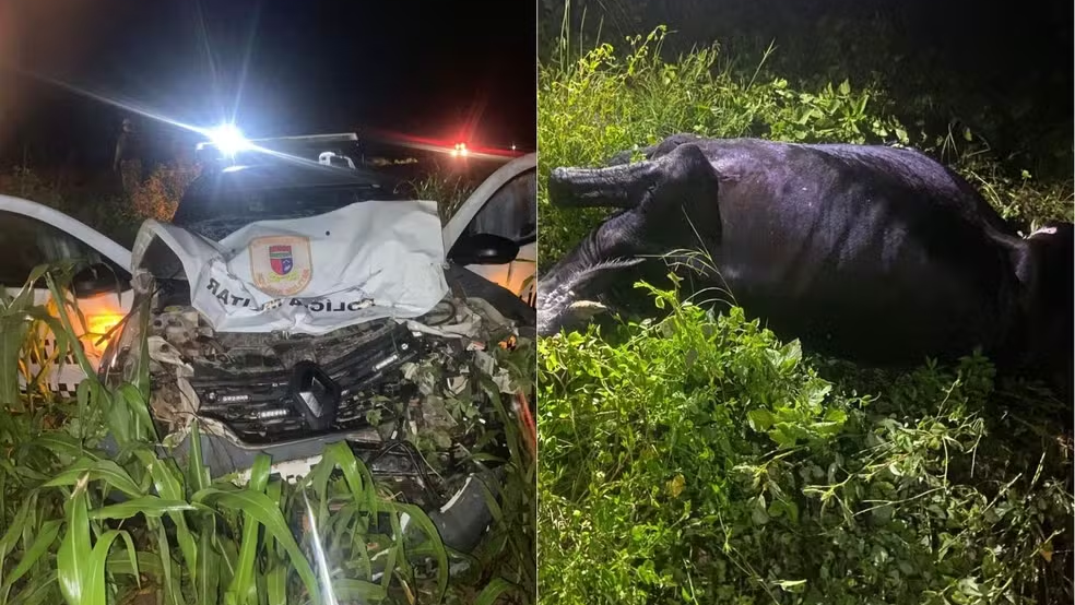Segundo a PM de Felipe Guerra, os militares trafegavam sentido ao município quando encontraram vários animais na pista. Ao bater em uma vaca, o motorista perdeu o controle do veículo, que teve a parte frontal destruída. O animal não resistiu ao impacto.